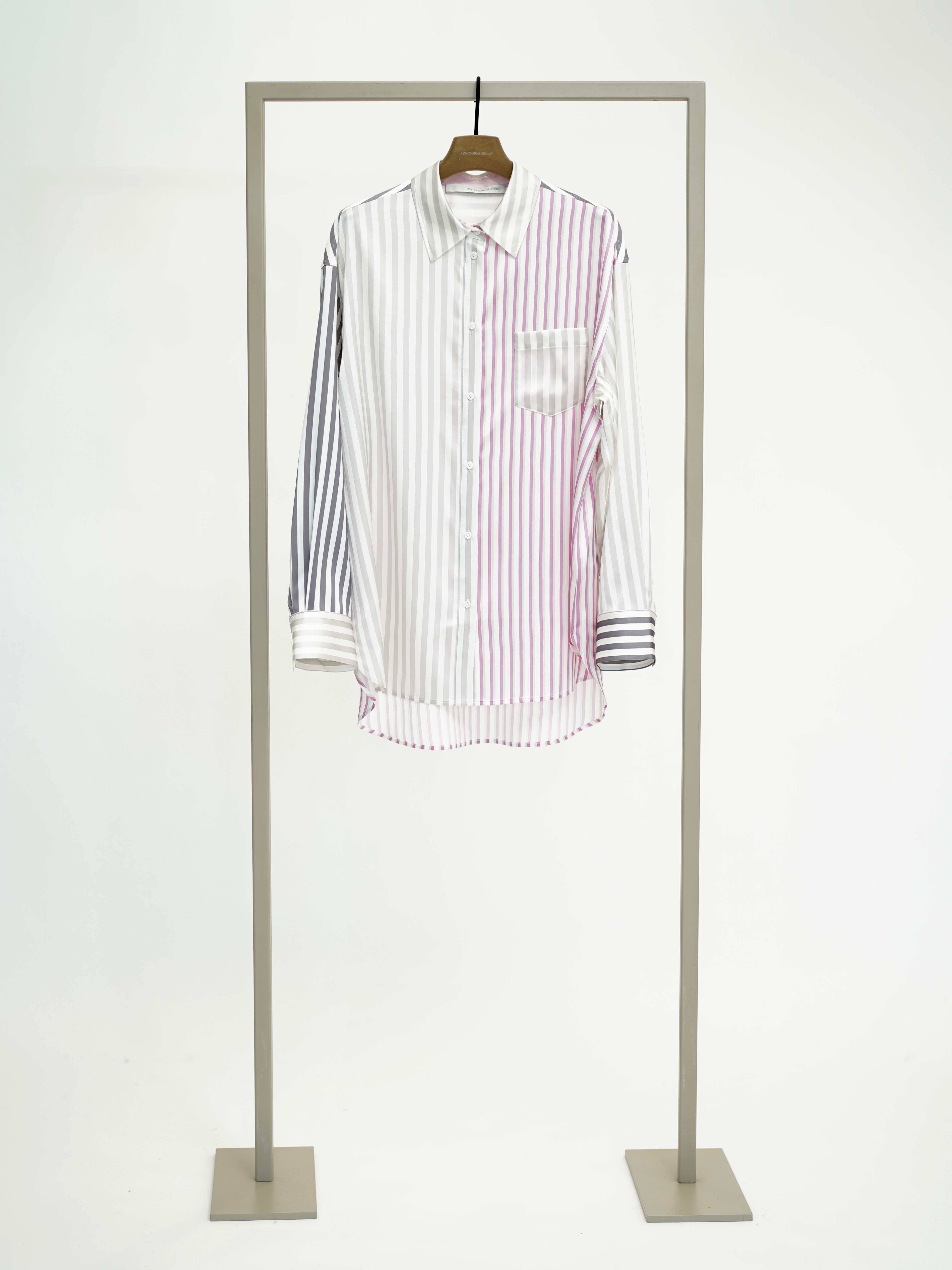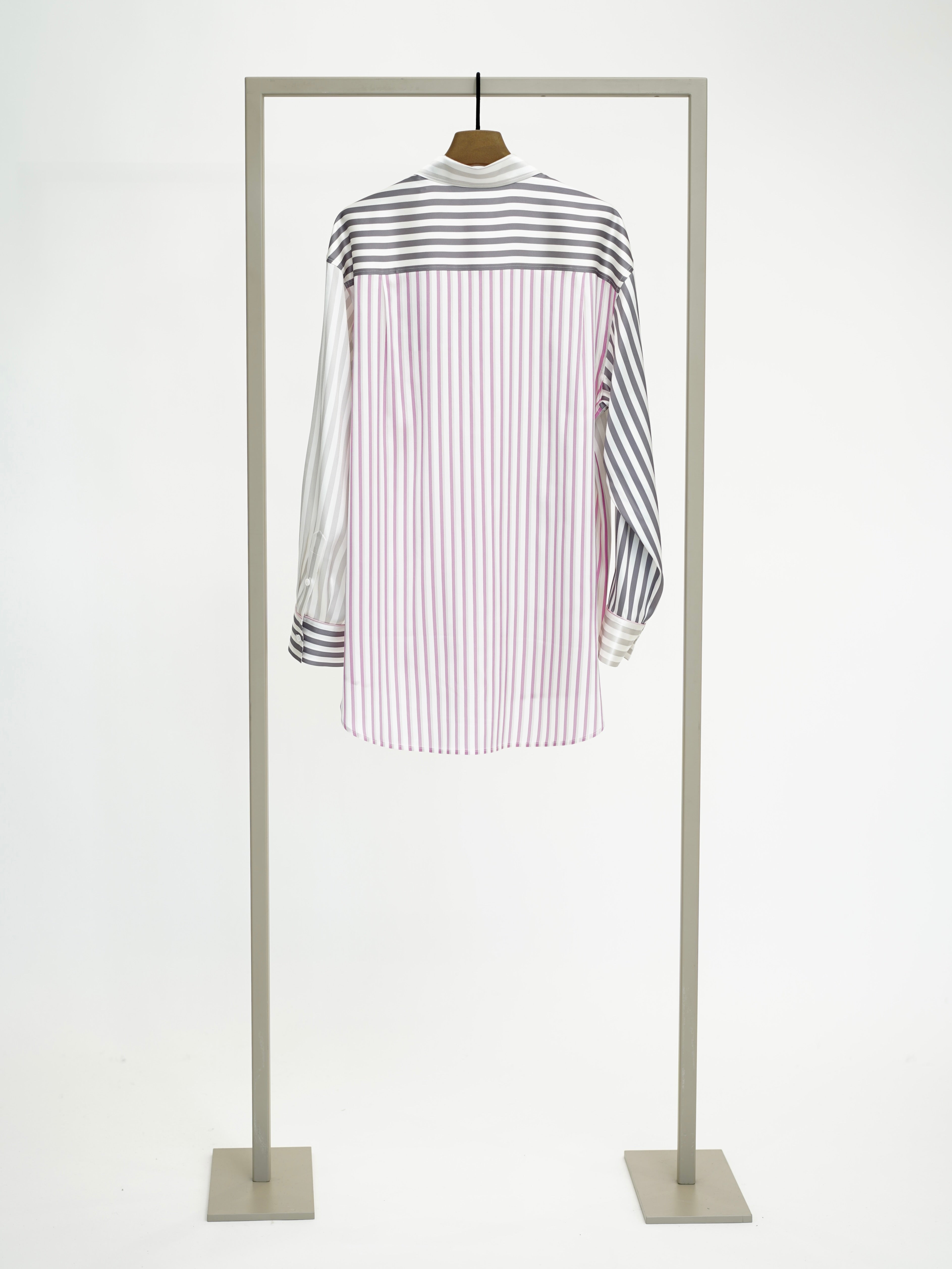 Long silk blouse with patch breast pocket and all-over striped print
