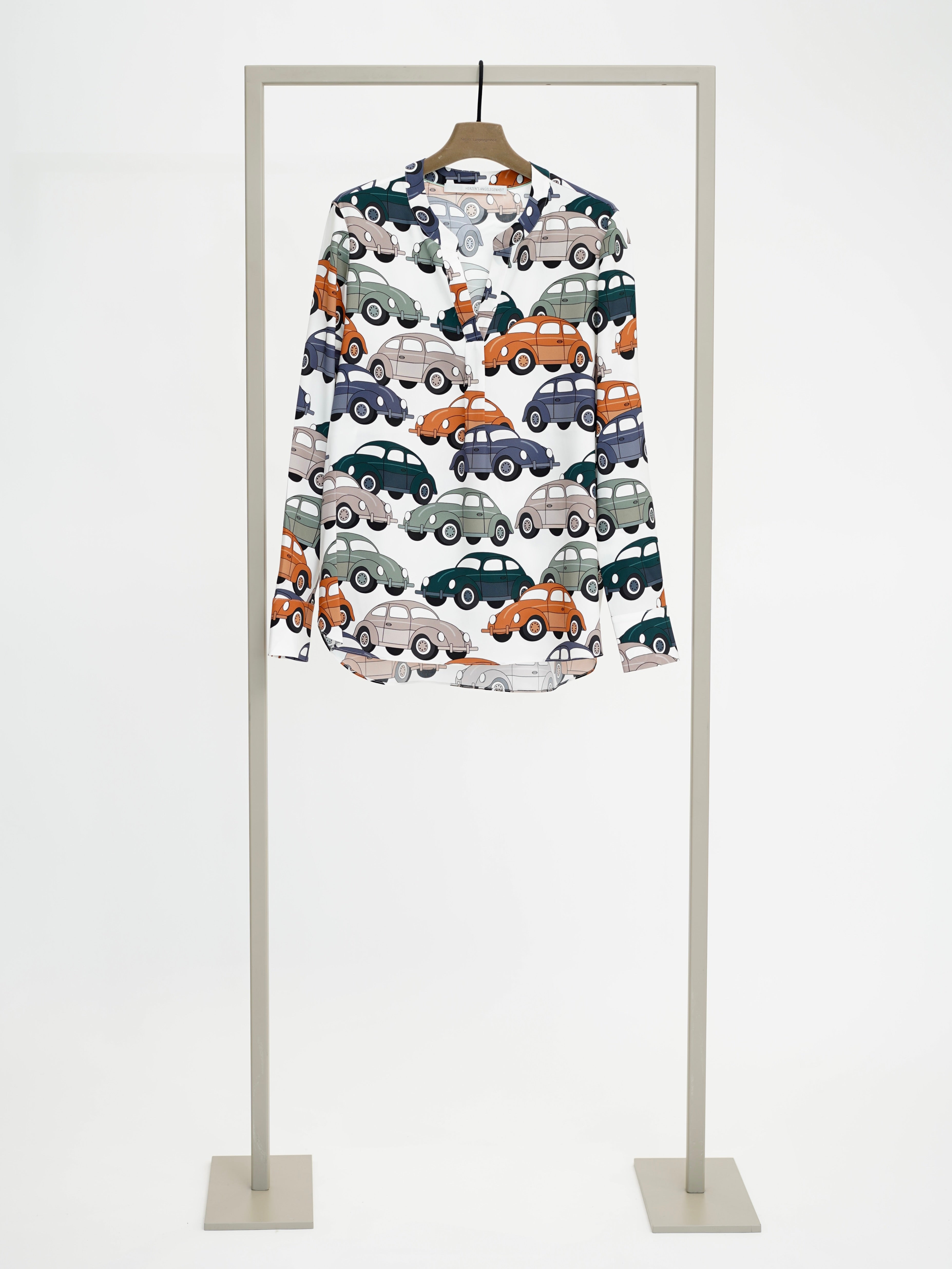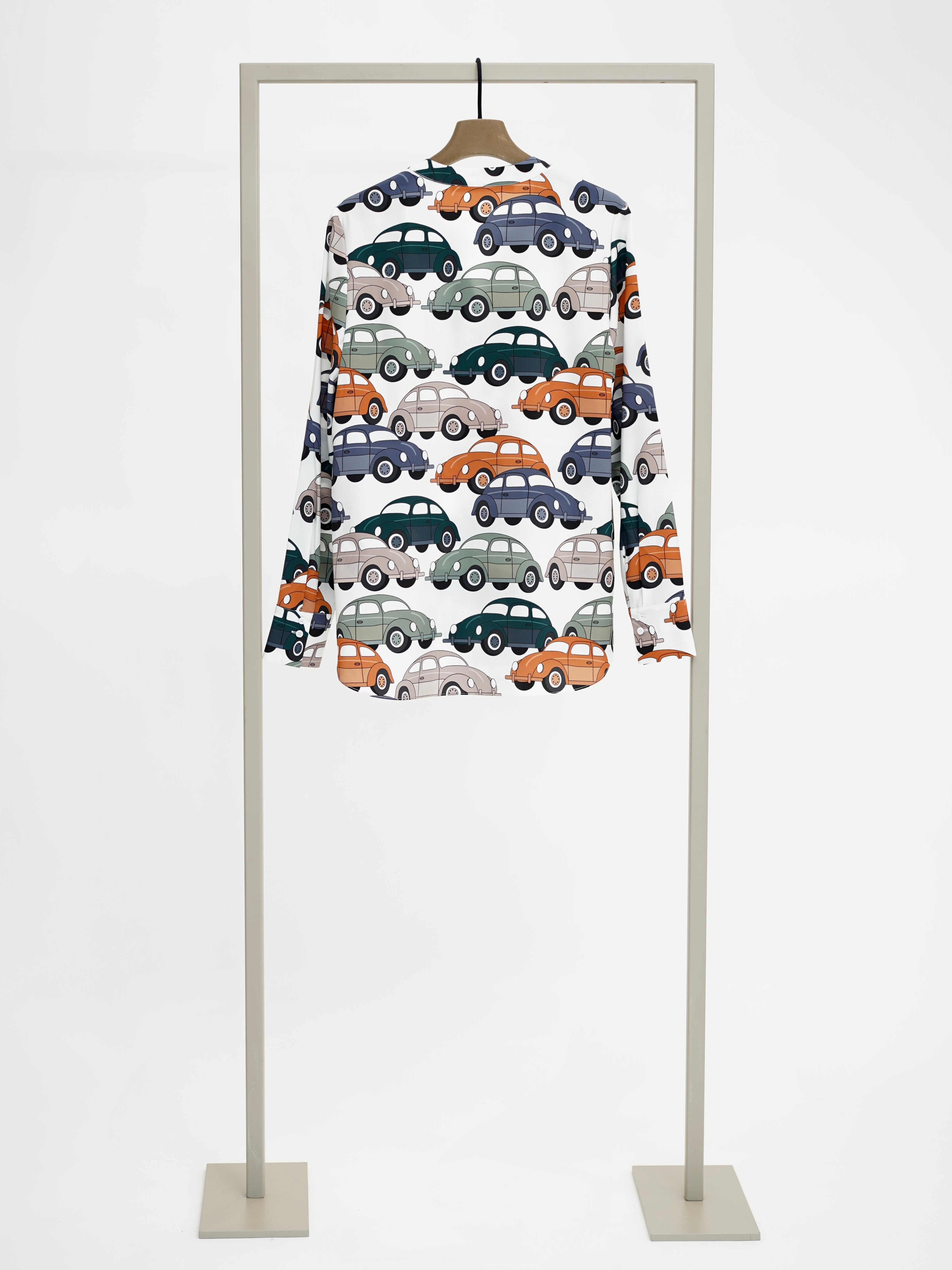 Blouse with tunic neckline and car print made of silk