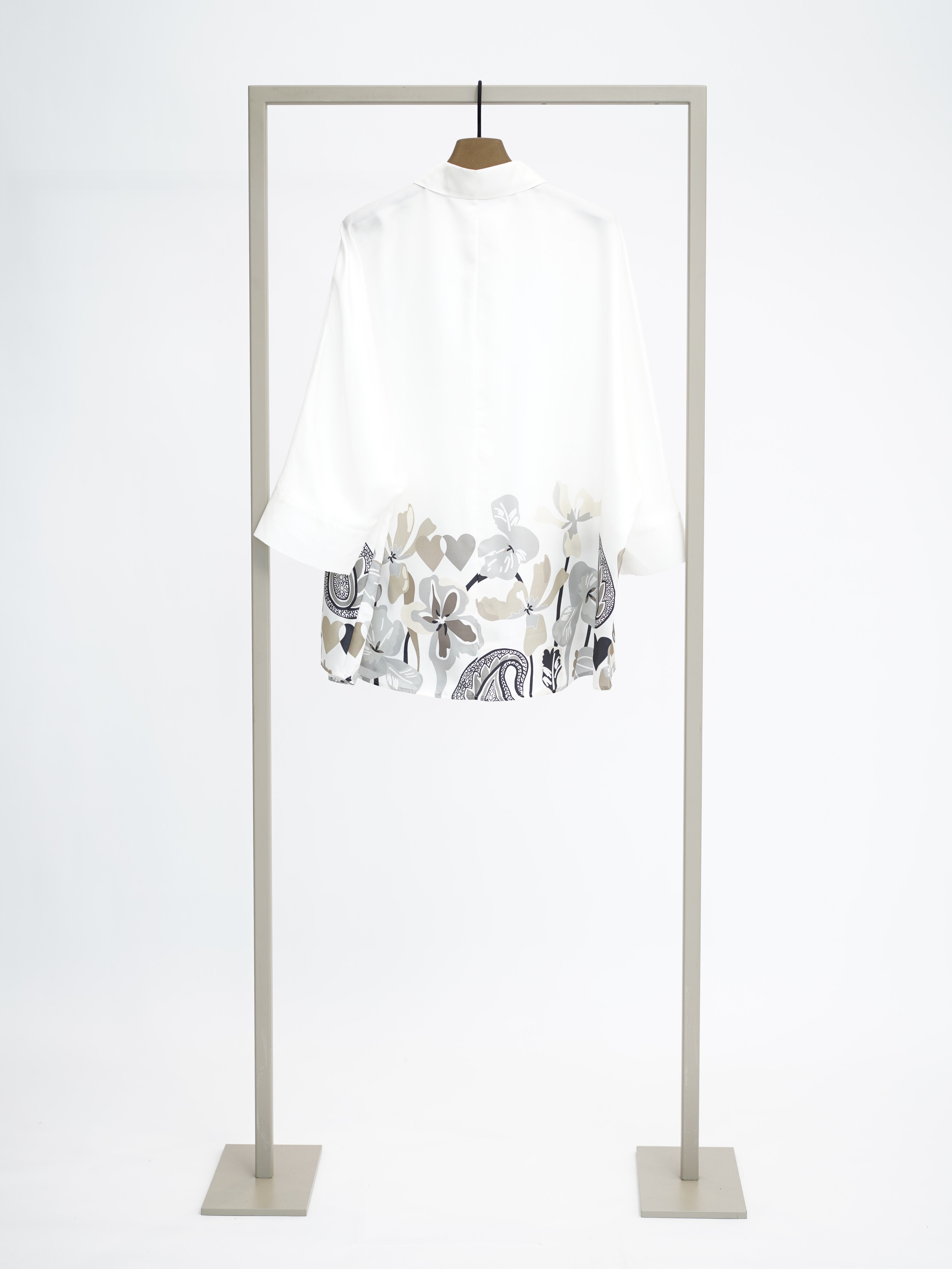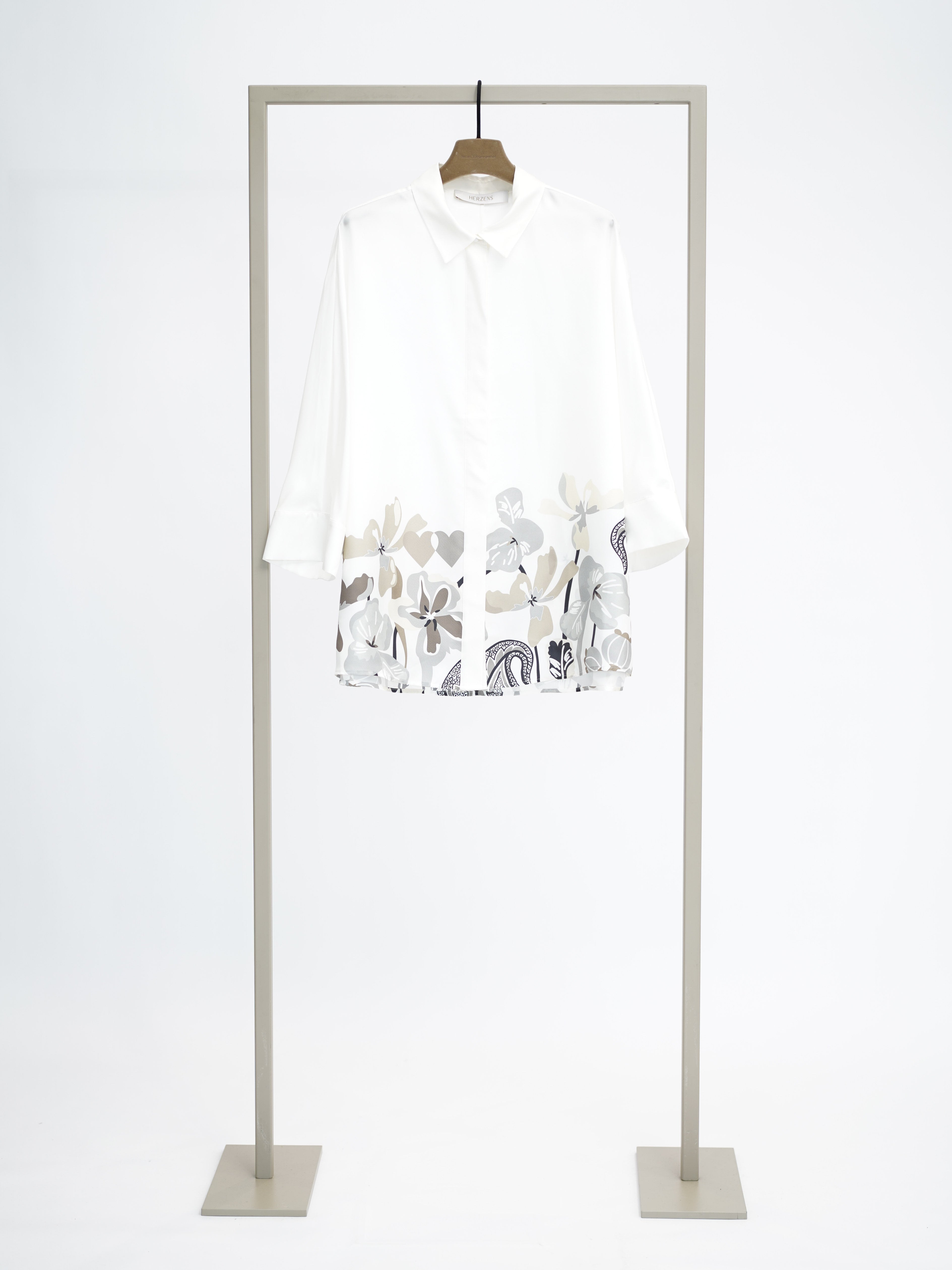 Lange Seidenbluse mit verdeckter Knopfleiste und floral geprinteten Saum